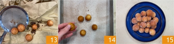 Pasa los buñuelos a papel absorbente para eliminar el exceso de aceite 13, luego ruédalos todavía calientes en una mezcla de azúcar y canela 14. ¡Tus buñuelos de ricotta dulces están listos para ser disfrutados 15!