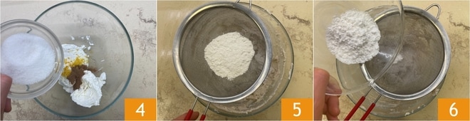 Añade el azúcar 4, luego tamiza la harina 5 y la fécula de patata 6.