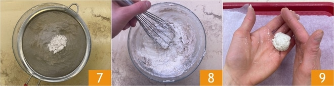 Agrega también la levadura en polvo tamizada 7 y mezcla hasta obtener una masa homogénea 8. Toma unos 12 g de masa a la vez y forma bolitas 9.