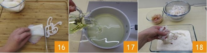 reducid luego los calamares a anillos de un grosor de aproximadamente 1 cm 16. En una cacerola grande de bordes altos, verted 1 l de aceite de semillas para freír 17 y llevadlo a una temperatura de 170-180° (podréis controlar la temperatura con un termómetro de cocina). Mientras tanto, pasad los calamares por la harina, asegurándoos de enharinarlos completamente 18,