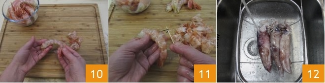 luego quitad el caparazón 10 y eliminad el intestino (el filete negro) del dorso, ayudándoos con un palillo 11. Reservad las gambas y pasad a la limpieza de los calamares: enjuagadlos bajo agua corriente 12,