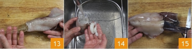 luego eliminad la pluma de cartílago interna 13 y enjuagadlos nuevamente para limpiar cuidadosamente el interior del manto 14. Después, retiradles la piel ayudándoos con un cuchillito 15