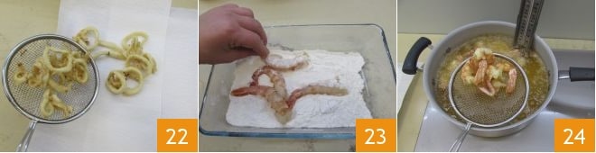 Colocadlos sobre un papel absorbente 22 y continuad de la misma manera con las gambas: enharinadlas cuidadosamente 23, eliminad el exceso de harina con un tamiz, luego pasad a freírlas en el aceite a temperatura, siempre pocas a la vez. Cuando estén bien doradas, escurridlas con una espumadera 24
