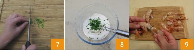 Por último, picad el cebollino 7 y añadidlo a la salsa de mayonesa y yogur 8. Luego reservad en el frigorífico hasta el momento de utilizarla y pasad a preparar la fritura. Comenzad con la limpieza de las gambas: separad la cabeza 9,
