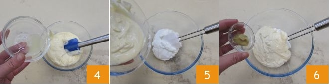 Verted el jugo de limón 4 y mezclad delicadamente con una espátula. Luego añadid la mayonesa en un bol donde habréis puesto el yogur griego 5, mezclad cuidadosamente la mezcla y añadid también la mostaza 6.