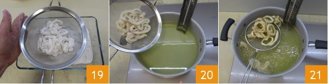 luego eliminad el exceso de harina tamizando los calamares con un colador 19. Cuando el aceite haya alcanzado la temperatura indicada, podéis freír los calamares, poco a poco 20 para no bajar demasiado la temperatura del aceite y arriesgaros a obtener una fritura blanda. Tomará pocos instantes y podréis escurrir los calamares dorados ayudándoos con una espumadera 21.