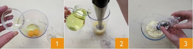 Para preparar el frito mixto de calamares y gambas con salsa de mayonesa y yogur, empezad con la salsa de acompañamiento: en un bol pequeño verted el huevo entero y la yema, añadid el vinagre de vino blanco 1, mezclad los ingredientes con un tenedor, luego vertedlos dentro de un vaso alto graduado, después empezad a batir con una batidora de inmersión, mientras vertéis poco a poco el aceite de semillas en hilo 2: esta operación sirve para evitar que la mayonesa se corte. Debéis obtener una mezcla aterciopelada y cremosa. Trasladadla a un bol pequeño, ajustad de sal y pimienta 3.