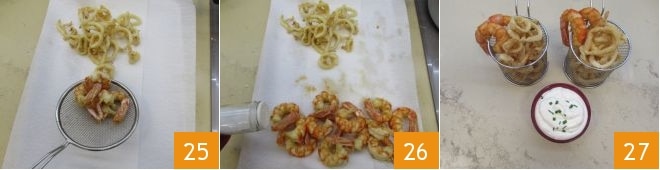 y colocadlas sobre el papel absorbente para escurrir el exceso de aceite 25. Sal al gusto la fritura 26 y servid el frito mixto de calamares y gambas con salsa de mayonesa y yogur 27!