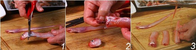 Proceded a la limpieza de los pescados, eliminando la cabeza 1 y las vísceras 2 del pescado. En el caso de los lanzones, eliminad las aletas dorsales y ventrales situadas a lo largo de todo el cuerpo cortándolas con unas tijeras, luego cortad el pescado en tres partes.3.