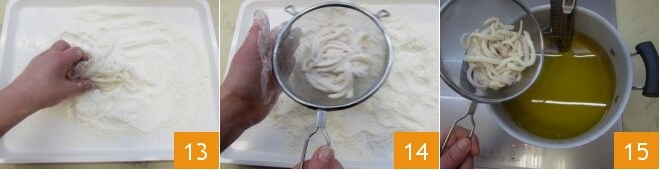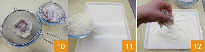 Luego pon todo en un colador para eliminar el exceso de agua 10. Ahora concéntrate en el rebozado: distribuye la harina en una bandeja 11, luego coloca los anillos de calamar 12,
