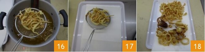 Escúrrelos con una espumadera 16 y colócalos en una bandeja forrada con papel absorbente para escurrir el exceso de aceite 17. Sazona con sal al gusto y sirve tu fritura de calamares caliente 18!