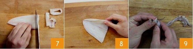 Corta el manto en anillos con un grosor de 0,5 cm 7 o, alternativamente, puedes obtener tiras finas: abre el manto como un libro, haz un corte en la parte final con un cuchillo, divídelo a la mitad y corta en tiras 8. Toma los tentáculos y elimina el diente central abriéndolos hacia afuera con las manos y empujando hacia arriba la parte central (es decir, la boca) 9.