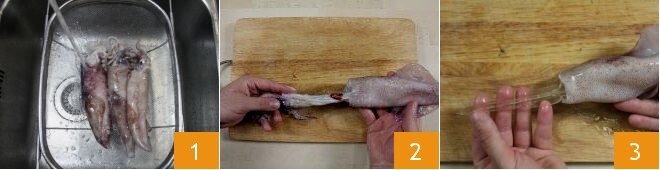 Para preparar la fritura de calamares, comienza con la Cómo limpiar los calamares: enjuágalos bajo abundante agua fresca corriente 1, luego con las manos separa suavemente la cabeza del manto 2. Una vez extraída la cabeza, nuevamente con las manos, busca la pluma de cartílago transparente en el manto y extráela con cuidado 3.