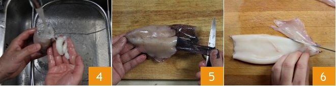 Pasa nuevamente el calamar bajo agua corriente 4, lávalo cuidadosamente y ayúdate con las manos para extraer las entrañas del manto. A continuación, elimina la piel externa: haz un corte con un cuchillo en la parte final del manto, lo suficiente para agarrar un borde de la piel, y retira completamente el revestimiento con las manos o ayudándote con un cuchillo 5. Para terminar la limpieza del manto, siempre con un cuchillo, retira las aletas 6.