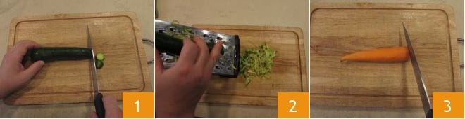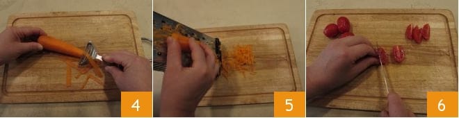y pélala 4, luego ralla también con un rallador de agujeros grandes 5. Entonces toma los tomatitos y córtalos por la mitad 6.