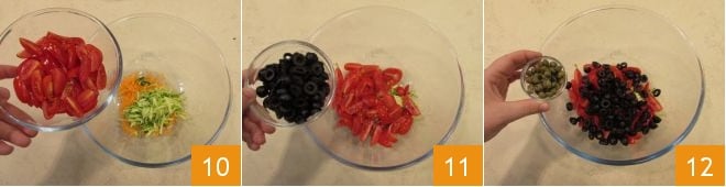 Luego añade también los tomatitos 10, las aceitunas 11 y las alcaparras desaladas 12.