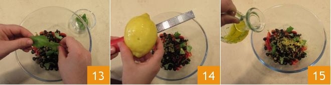 Trocea groseramente la albahaca 13 y ralla una cáscara de limón no tratado para un toque cítrico 14. Rocía con un hilo de aceite de oliva en crudo para dar sabor 15.