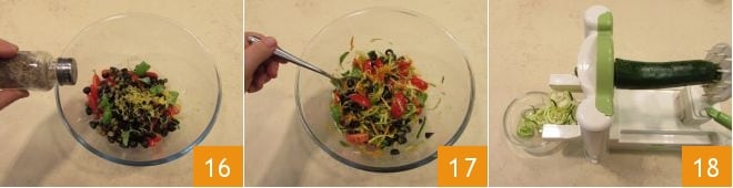Regula de sal y pimienta 16 y mezcla todos los ingredientes 17. Tu aderezo está listo: resérvalo. Ahora pasa a las verduras para la decoración. Corta los extremos del calabacín, luego saca espirales de verdura con el cortador de verduras en espiral 18.