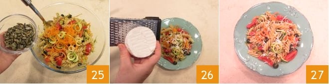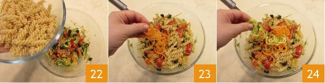 Escúrrelos aún al dente directamente en el bol con el aderezo de verduras en crudo 22 y mezcla bien. Añade las zanahorias cortadas en espiral 23 y también los calabacines de decoración 24.