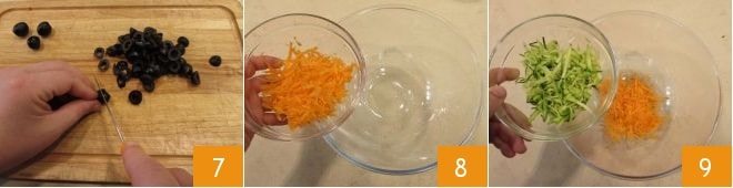 Corta las aceitunas en rodajas 7. Toma un bol grande y vierte las zanahorias 8 y los calabacines 9.