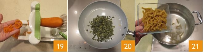 Repite la operación con la zanahoria, después de pelarla 19. Si no tienes un cortador de verduras, puedes usar una mandolina y obtener tiras muy finas de calabacines y zanahorias que luego puedes cortar en tiras finas con el cuchillo. Reserva las verduras de decoración. Procede tostando 1 minuto las semillas de calabaza en una sartén antiadherente 20 y resérvalas. Cuece los fusilli integrales en abundante agua salada 22.