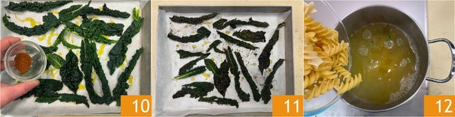 Añade el pimentón 10 y cocina en horno estático precalentado a 190° durante 10 minutos 11. Mientras tanto, cocina la pasta en el agua de cocción de la col negra 12.