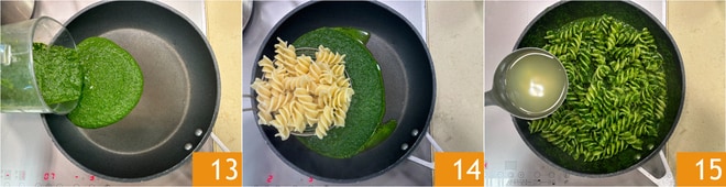 Vierte la crema de col negra en una sartén 13, luego escurre aquí los fusilloni al dente 14. Añade un cucharón del agua de la pasta 15 y termina la cocción en la sartén.