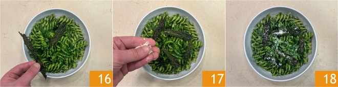 Emplata decorando con las chips de col negra 16 y una pizca de Parmigiano Reggiano DOP rallado 17. ¡Los fusilloni con crema de col negra están listos para ser disfrutados 18!