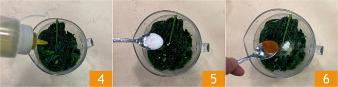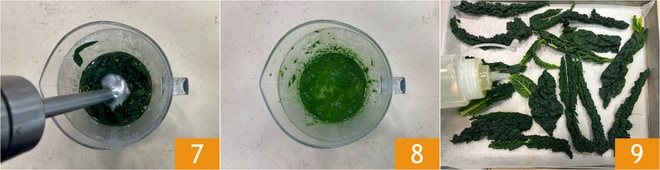 Tritura 7 con una batidora de mano hasta obtener una crema homogénea 8. Si es necesario, puedes añadir un cucharón de agua de cocción de la col. Coloca las hojas restantes en una bandeja cubierta con papel de horno y condimenta con el aceite 9.