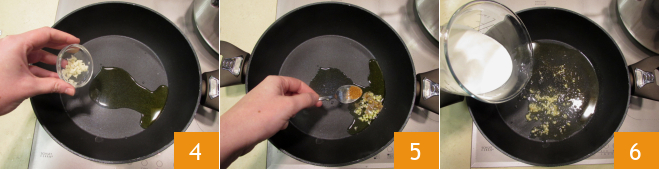 En una cacerola vierte un chorrito de aceite, el ajo pelado y picado 4, el comino y el chile en polvo 5. Deja que las especias se impregnen ligeramente, luego vierte la nata 6.