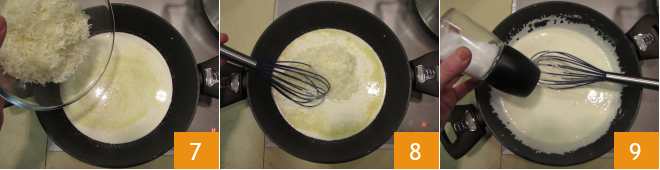 Tan pronto como la nata se haya calentado, añade 160 g de Pecorino 7, mezcla con una varilla suave 8 o una cuchara de madera para derretir el queso. Salpimienta al gusto 9 y luego apaga el fuego.