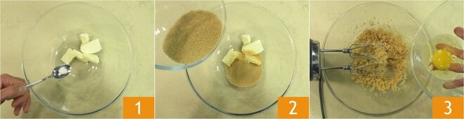 Para preparar las galletas a la cuchara, primero asegúrate de que los ingredientes estén a temperatura ambiente. En un bol, mezcla la mantequilla blanda con la sal 1 y el azúcar moreno 2 y bate durante un par de minutos con una batidora eléctrica, luego añade el huevo 3 y mezcla durante otro minuto.