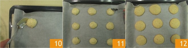 Forra una bandeja para hornear con papel de horno, toma una cucharada de masa 10 y con la ayuda de otra cuchara deja caer sobre la bandeja, dejando unos centímetros de distancia entre una galleta y otra 11. Hornea en un horno estático precalentado a 180° durante unos 15 minutos. Una vez cocidas, saca y deja enfriar tus galletas a la cuchara antes de degustarlas 12.