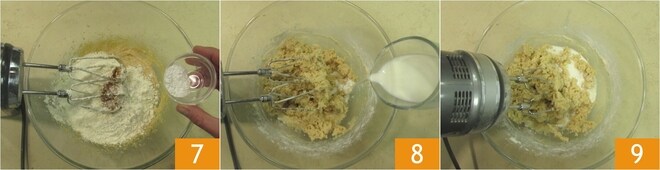 Añade también la levadura 7 y, mientras mezclas todo con las varillas, vierte la leche poco a poco 8. Continúa mezclando 9 hasta obtener una mezcla homogénea.