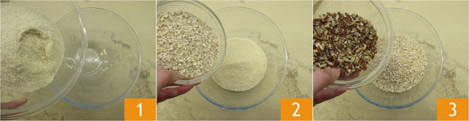 Para preparar vuestras galletas de avena y nueces, verted en un bol la harina de almendra 1, el salvado de avena 2, las nueces picadas 3.
