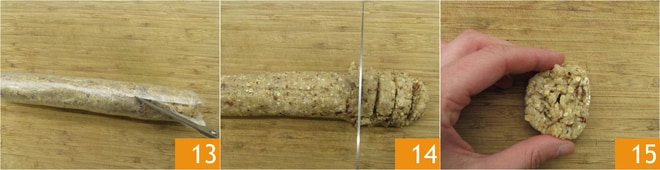 Pasado el tiempo necesario, cortad el film y con un cuchillo 13 sacad unas rodajas de aproximadamente 1 cm de grosor 14. No importa si no mantienen la forma perfecta 15, podéis acomodarlas mientras las colocáis en la bandeja.