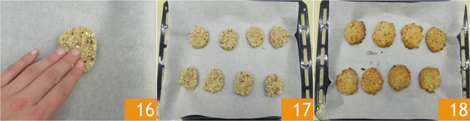 Ahora colocadlas en una bandeja con papel de horno 16, asegurándoos de dejarlas un poco separadas 17, porque en el horno tenderán a expandirse un poco. Coced en horno estático precalentado a 175°C durante 20 minutos. Una vez que estén bien doradas, podéis sacarlas del horno y dejarlas enfriar completamente a temperatura ambiente. Cuando estén frías vuestras galletas estarán listas para disfrutarse 18.