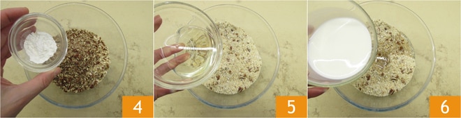 Añadid también la levadura para postres 4, la sal y mezclad rápidamente con una cuchara. Luego agregad el aceite de girasol 5 y la leche 6.