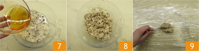 Para terminar, endulzad con la miel 7. Mezclad hasta obtener una mezcla homogénea 8. Extendiendo sobre la mesa dos trozos de film transparente y colocad encima la masa 9.