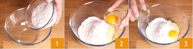 Para preparar las galletas blandas de limón sin gluten, en un bol verted la mezcla de harinas sin gluten 1, el huevo entero frío 2 y el jugo del limón 3.