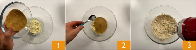 Para preparar las galletas con chispas de chocolate, lo primero que tienes que hacer es colocar la mantequilla blanda en un bol, añadir el azúcar moreno 1 y una pizca de sal 2. Trabaja con las varillas eléctricas hasta obtener una consistencia cremosa y montada 3.