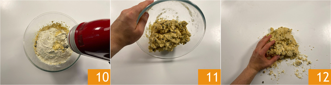 Acciona de nuevo las varillas eléctricas durante unos minutos 10 hasta obtener una mezcla homogénea. Luego transfiere la masa a la superficie 11 y compacta con las manos 12.