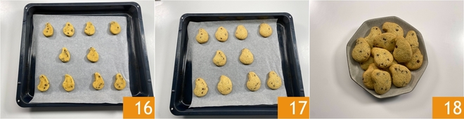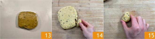 Envuelve el bloque en film transparente 13 y deja reposar en el frigorífico durante al menos 30 minutos. Pasado este tiempo, podrás formar las galletas. Toma un trozo de unos 30 g 14. Forma una bolita, aplánala y dale forma de gota moldeando la masa con las manos 15.