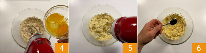 Añade el huevo ligeramente batido 4 y mezcla de nuevo hasta que esté bien absorbido 5. En este punto, añade el extracto de vainilla 6.