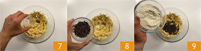 Añade también el bicarbonato 7, las chispas de chocolate 8 y la harina 9.
