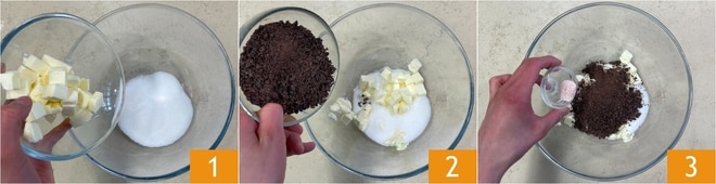 Para realizar las galletas con chocolate negro y sal rosa del Himalaya, vierte el azúcar y la mantequilla ablandada en un bol 1, luego añade el chocolate negro finamente picado 2 y la sal rosa 3.