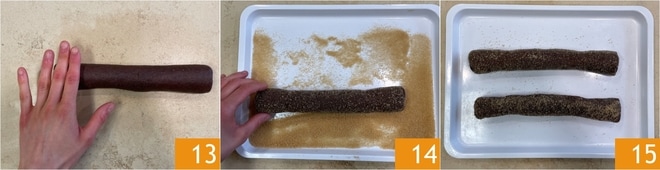 Forma 2 cilindros de aproximadamente 4 cm de diámetro 13, luego enróllalos en azúcar moreno para recubrirlos completamente 14. Coloca los cilindros en una bandeja y déjalos endurecer en el frigorífico durante 2 horas 15.