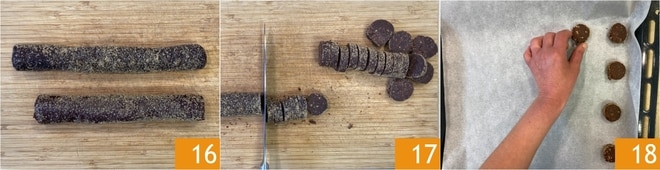 Pasado el tiempo de endurecimiento 16, corta los cilindros en rodajas de aproximadamente medio centímetro de espesor 17. Coloca las rodajas en una bandeja de horno forrada con papel pergamino, separándolas entre sí 18.