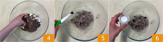 Mezcla los ingredientes con las manos 4, luego añade las semillas de la vaina de vainilla 5 y el bicarbonato 6. Continúa trabajando la mezcla hasta obtener una consistencia homogénea.