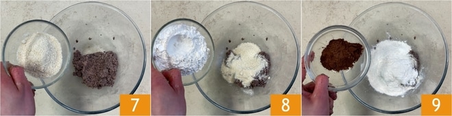 Cuando hayas formado un bloque, añade la harina de almendra 7, la harina 00 8 y el cacao amargo 9.